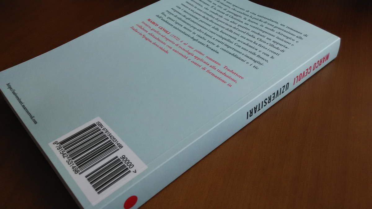Devo ammettere, magari rischiando di essere un po' presuntuoso, che sono molto soddisfatto dell’edizione cartacea di Uziversitari. La copertina è di cartoncino leggero, in linea con quelle di qualunque altro paperback. Ho scelto la finitura opaca e forse l’unico appunto è la resa del colore scelto. A schermo il colore celeste sembrava leggermente più intenso. In ogni caso anche così, con questo turchesino pallidino, lo stile è perfettamente in linea con quello che volevo adottare.